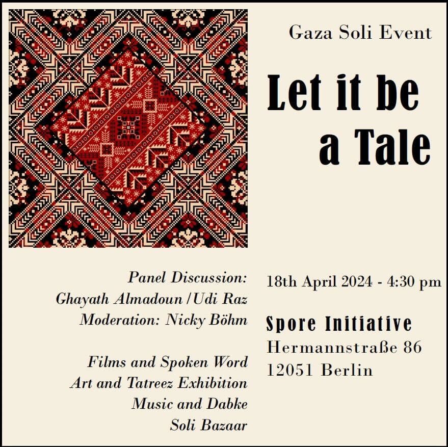 Palestine fundraiser: Head to Spore Initiative on Thursday 18 April for Let It Be A Tale, a fundraising event for humanitarian relief in Gaza. The evening will include a market, music, poetry, art, a film screening and a panel discussion with Palestinian poet Ghayath Almadoun and Jüdische Stimme’s Udi Raz, moderated by Nicky Böhm.