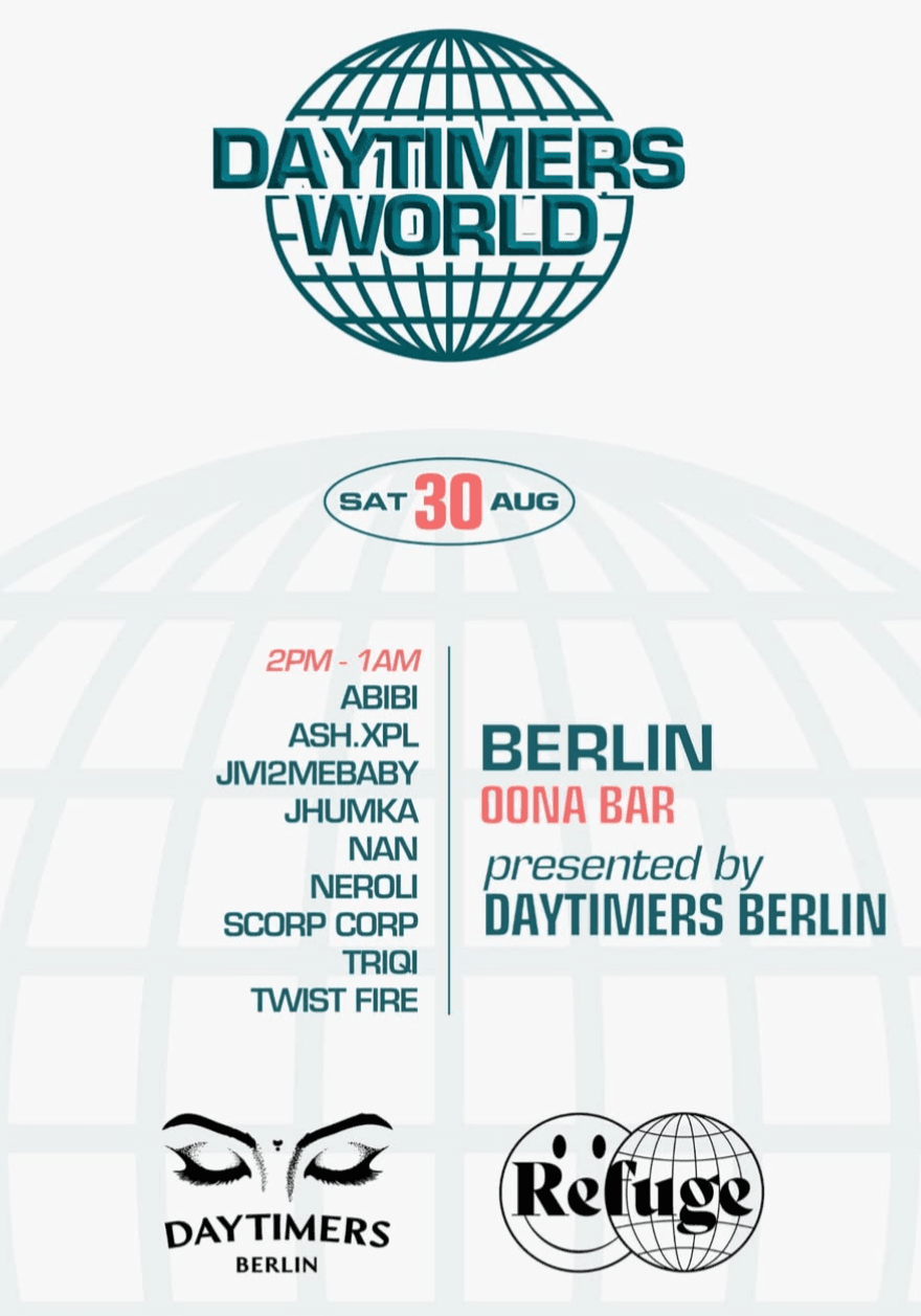 DAYTIMERS WORLD marks five years of amplifying South Asian voices with a celebration in 8 cities across the globe. Spanning Melbourne, Berlin, London, Manchester, Bristol, Zurich, Toronto, and New York City, the party goes big. The Berlin chapter takes over Refuge Worldwide with a full day of groovy, percussive mixes curated by collectives and DJs shaping the scene.