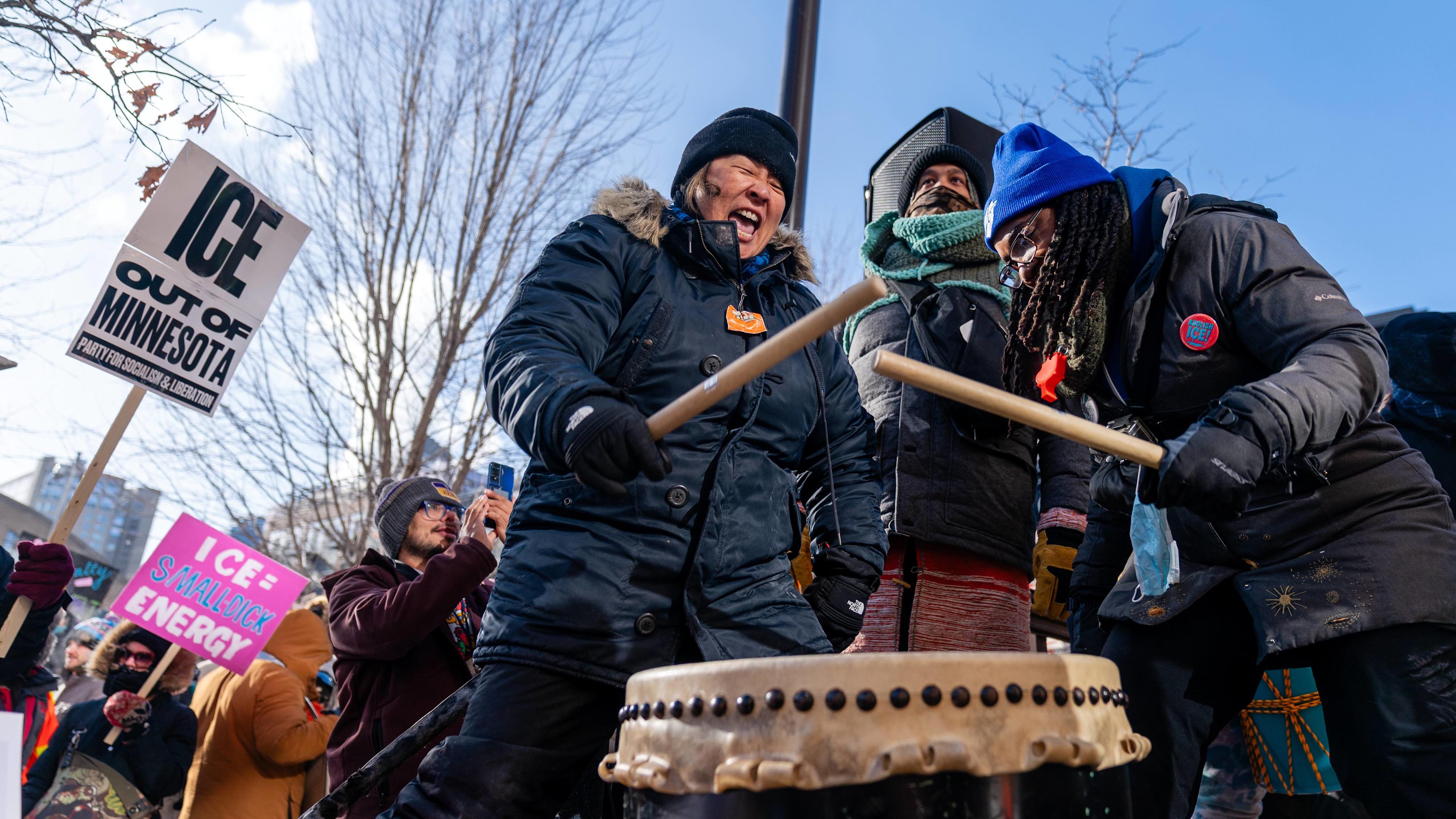 image by Lorie Shaull shows drummers playing at The Commons where protesters gather for the "Ice Out of MN" march in Minneapolis, Minnesota. this file is licensed under the Creative Commons Attribution 4.0 International license. https://creativecommons.org/licenses/by/4.0/deed.en